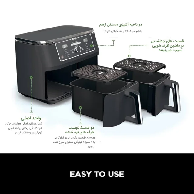 سرخ کن بدون روغن نینجا مدل AF400 یک دستگاه هوشمند و کم مصرف است که با استفاده از فناوری هوای گرم، غذاها را با کمترین روغن و کاملاً سالم و خوشمزه آماده میکند. ظرفیت مناسب، کنترل دیجیتال و طراحی کاربردی از ویژگیهای برجسته این محصول است.